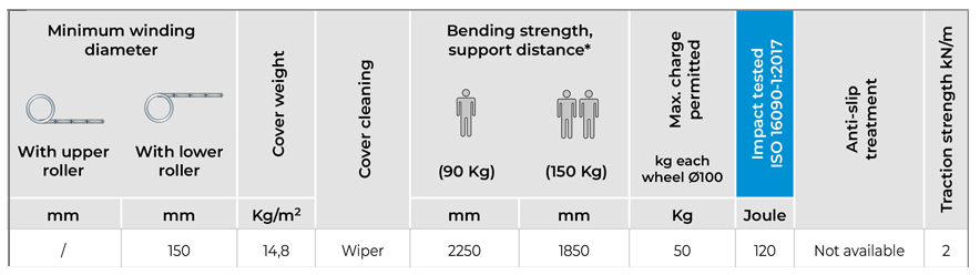 This roll-up cover is provided with a 15.5 mm thick JM aluminium profile. All “J”-series apron covers are impact tested according to ISO 16090-1:2017.