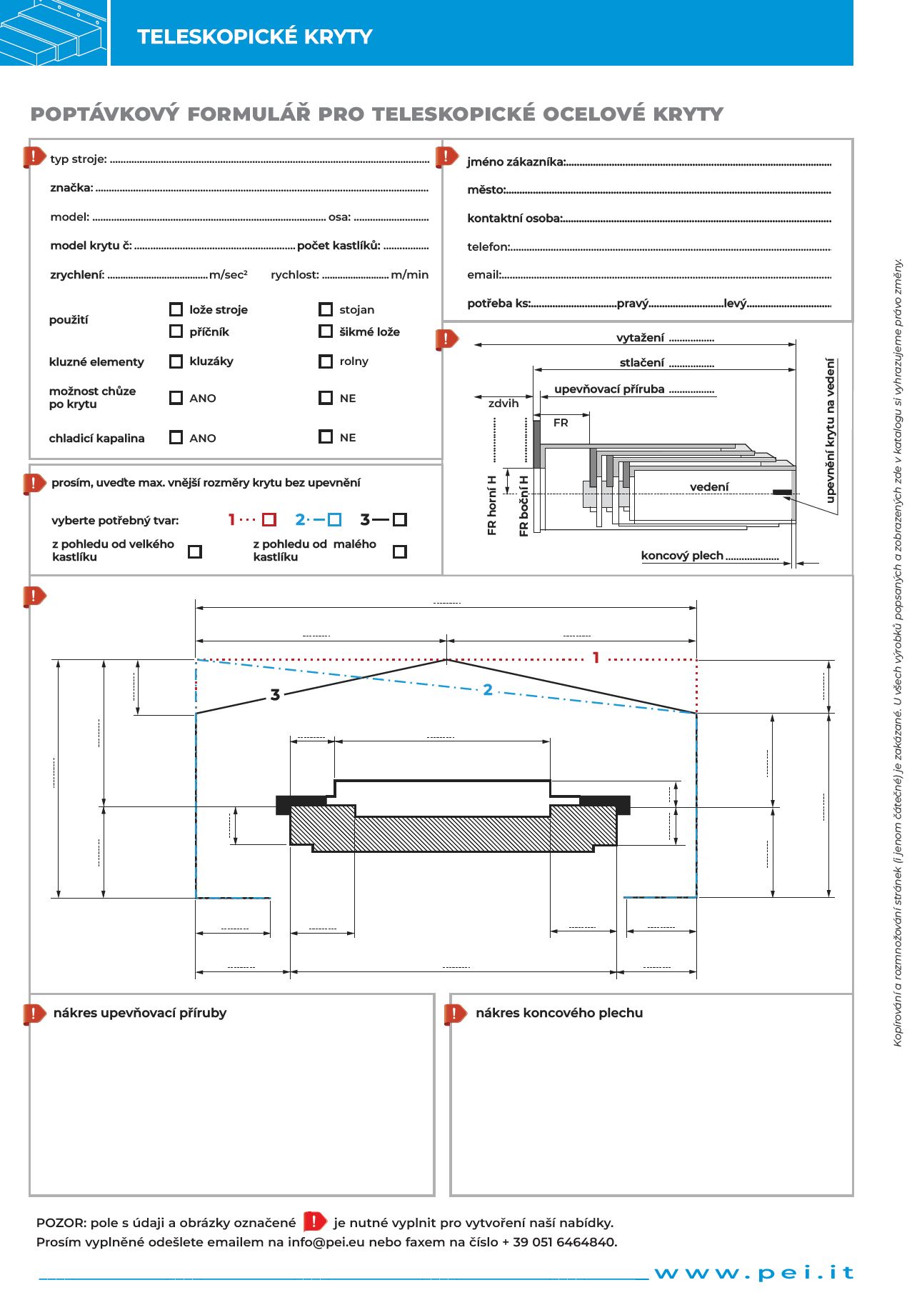 Varianta tvaru 3: výhoda dvojitého sklonu, který vyztužuje desky kazet a umožňuje vysoké a dlouhodobé stírání teleskopických prvků, se spojuje s asymetrií tvaru, která vede k většímu vnitřnímu využitelnému prostoru pro uložení kabelových řetězů nebo jiných zařízení umístěných rovnoběžně s osou stroje. Vhodné pro malé až střední a velké rozměry krytů, dokonce i pro dlouhé dráhy. Umožňuje nasměrovat chladicí kapalinu a třísky ke sběrnému zařízení.