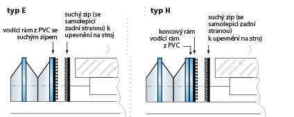 | upevnění měchu je provedeno pomocí rámu z PVC se suchým zipem; další suchý zip je připevněn přímo na stroj, toto provedení nabízí podstatné výhody: • rychlé upevnění a odstranění měchu • je s malými náklady doporučeno pro suché pracovní prostředí | ![]() |