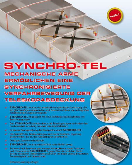 • SYNCHRO-TEL ist eine neu entwickelte mechanische Vorrichtung, die ein gleichmäßiges Auseinander- und Zusammenfahren von mittelgroßen Teleskopabdeckungen ermöglicht.