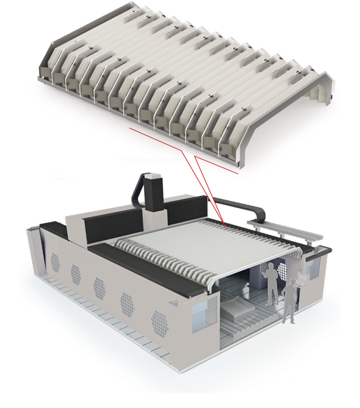 Es-Wave-CoverThis P.E.I. solution is a complete roof cover for Gantry and Portal machines with a reduced Z-axis that allows the machine operators to access the machining chamber without opening the cover.