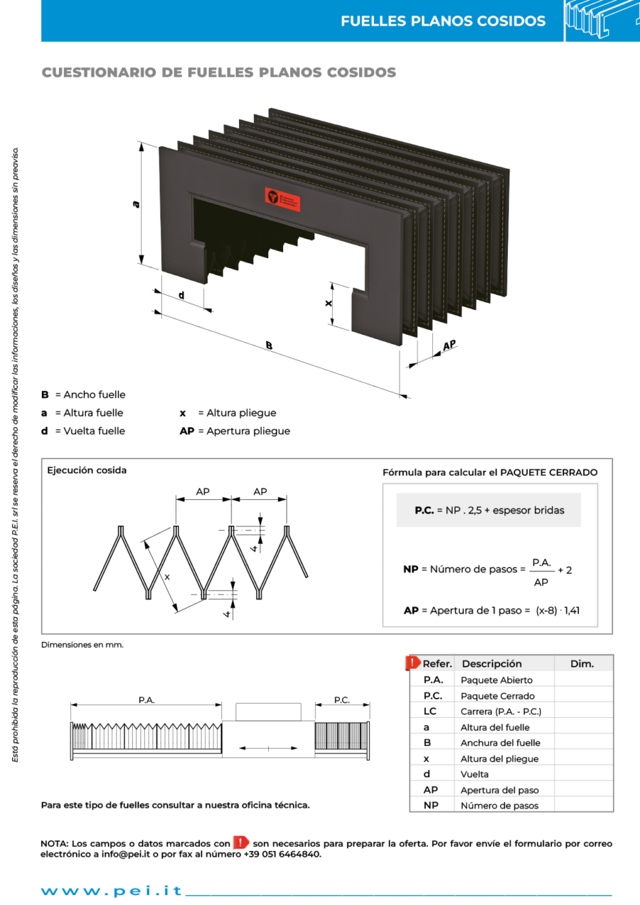 Los fuelles planos cosidos producidos por PEI tienen la gran ventaja de ser especialmente robustos y de tener un paquete cerrado muy reducido en relación con la carrera del fuelle. Este modelo se realiza mediante un doble cosido en las aletas del fuelle. El fuelle cosido se mantiene limpio, sin virutas ni aceites residuales, ya que no hay pliegues de tejido que impidan la caída en el extractor. Los fuelles cosidos presentan un paquete cerrado menor que el de los tradicionales fuelles termosoldados ya que no hay pliegues de tejido en la esquina. La gama de geometrías que se pueden construir es prácticamente infinita. Si la aplicación en la máquina requiere rigidez estructural, se pueden añadir refuerzos metálicos intermedios, perfilados para un apoyo seguro en las guías.