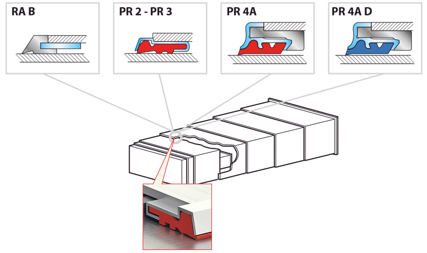 - Los códigos RA B están constituidos por una inserción metálica sobre la que se vulcaniza un perfil de NBR. Los rascadores se suministran en barras.