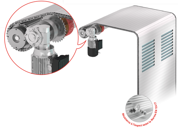 L’enroulement est réalisé par le biais d’un mécanisme PEI tandis que le déroulement a lieu grâce à un moteur qui entraîne des chaînes latérales intégrées et fixées au tablier armé pour créer un effet crémaillère.