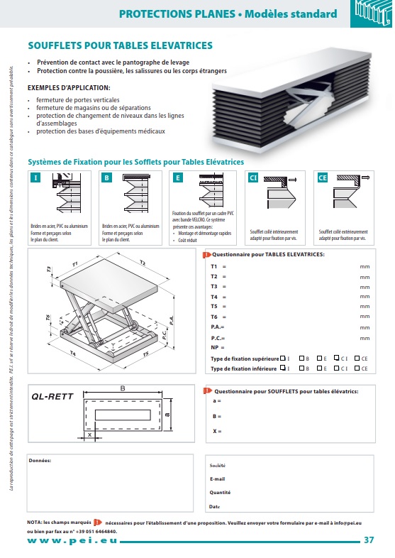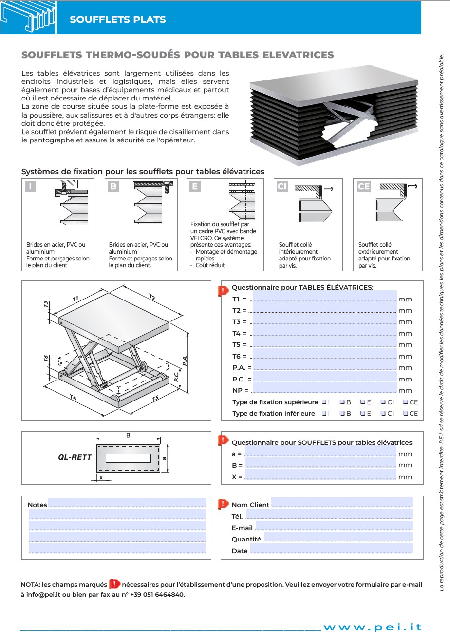 Le soufflet QUICK BOX BELLOW est fourni en pièces séparées qu’il suffit d’assembler par de simples fixations mécaniques – sans besoin d’outils – et d’appliquer ensuite sur la table élévatrice.