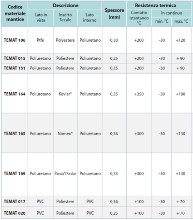 | TEMAT 017 | PVC | Poliestere | PVC | 0,36 | +100 | -30 | + 70 | Impiegato principalmente in presenza di polvere ambientale, piccoli spruzzi di refrigeranti ed oli. Idonei anche in presenza di acidi. |