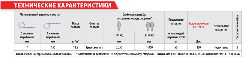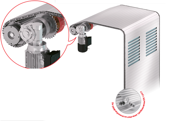 3ащита сматывается механизмом намотки P.E.I., приводимым в движение боковым приводом, благодаря цепям, закреплённым по бокам ограждения (аналогично зубчато-реечному механизму).